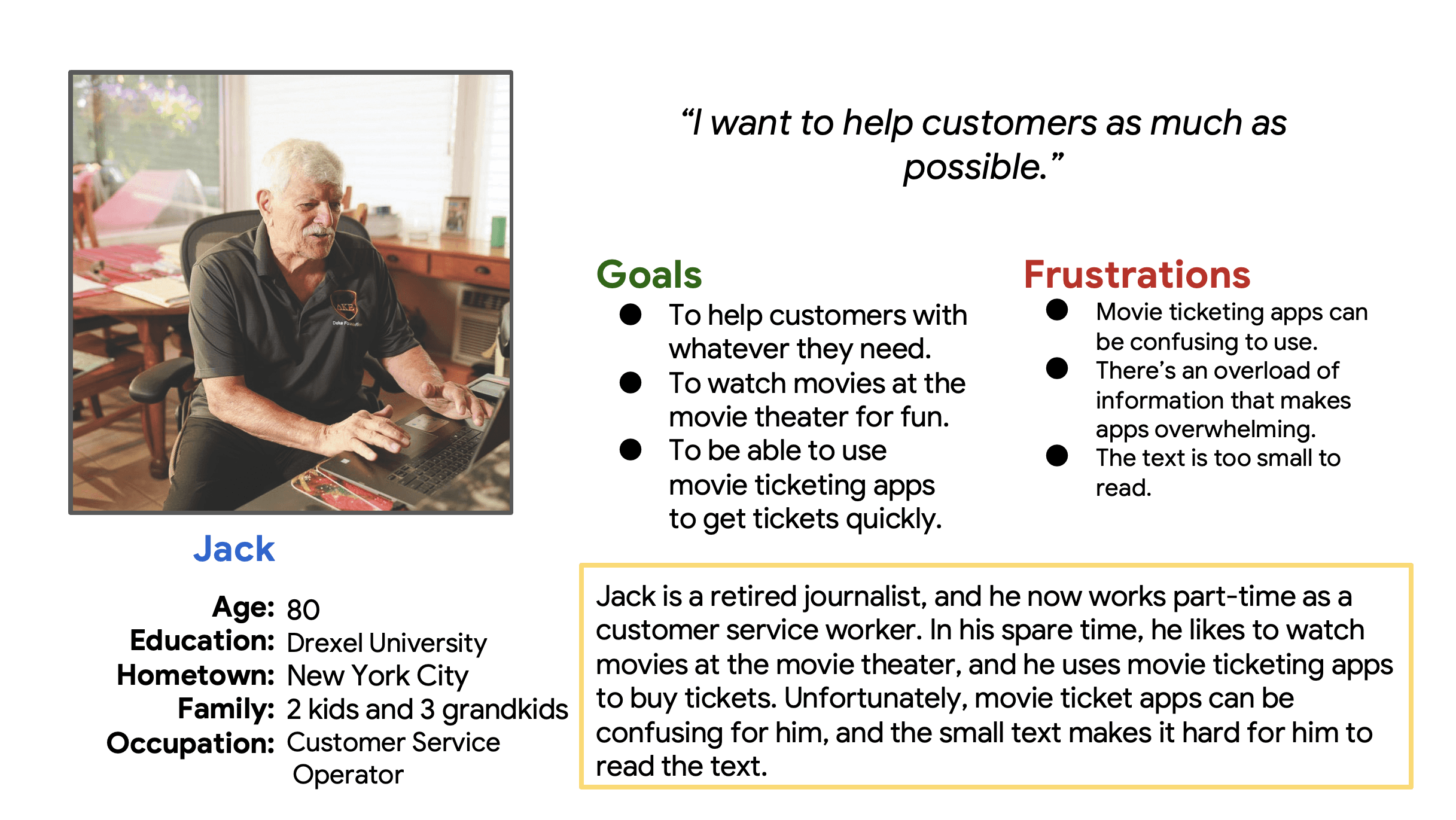 Based on what I had learned about the different types of users who went to movie theaters. I created two user personas. The first persona is a 23-year-old software engineer named Olivia. She has to get movie tickets for her coworkers and so uses the movie ticketing app to purchase the tickets. The second is a retired journalist named Jack who now works part-time as a customer service operator. He wants to use the ticketing app to get tickets for watching movies in his spare time. But he has issues using a lot of movie ticketing apps because they can be confusing for him.