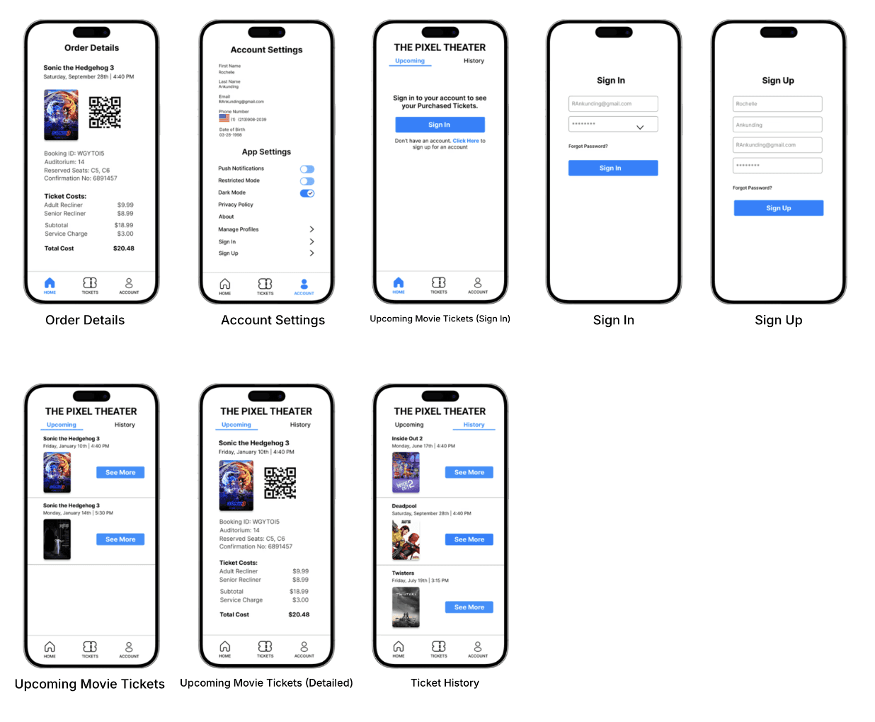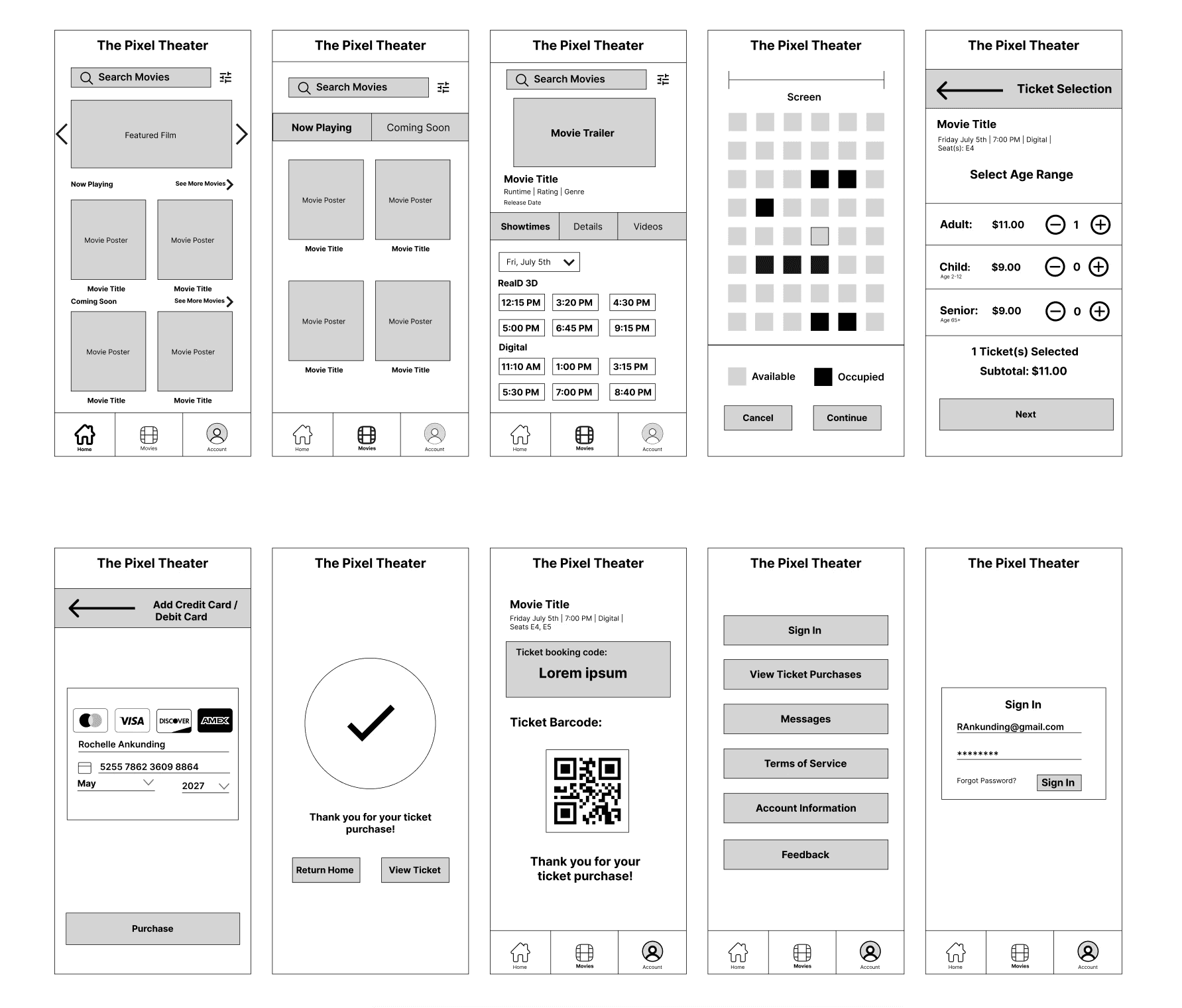 After the sketches were completed, I moved on to creating a low-fidelity prototype of the app using Figma. There was a home page that had feature films and showed some of the movies that were playing. There was a film page that was dedicated towards finding movies that were currently playing and coming soon. There were a series of frames dedicated to users purchasing tickets for movies and than seeing their ticket purchase. There was an account page where a user could view pages for ticket purchases and other topics.
