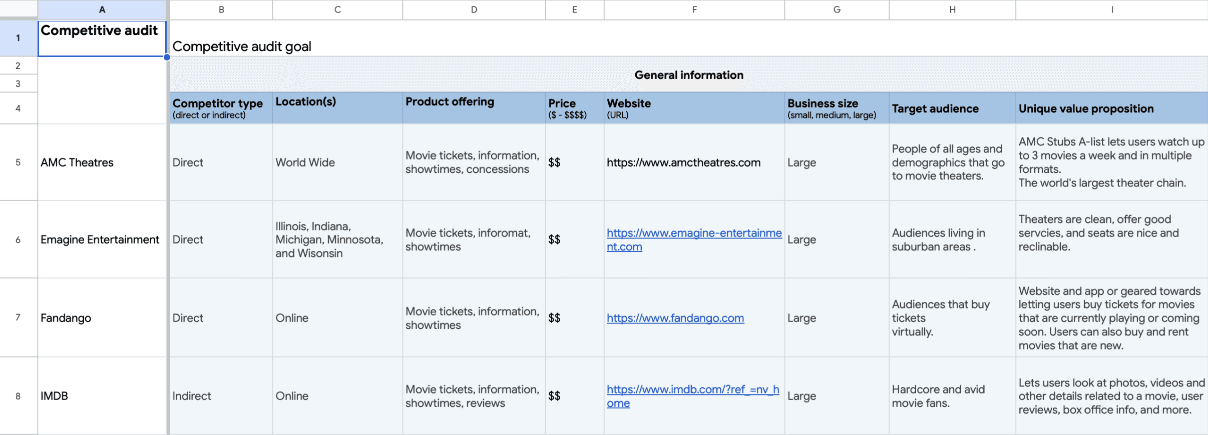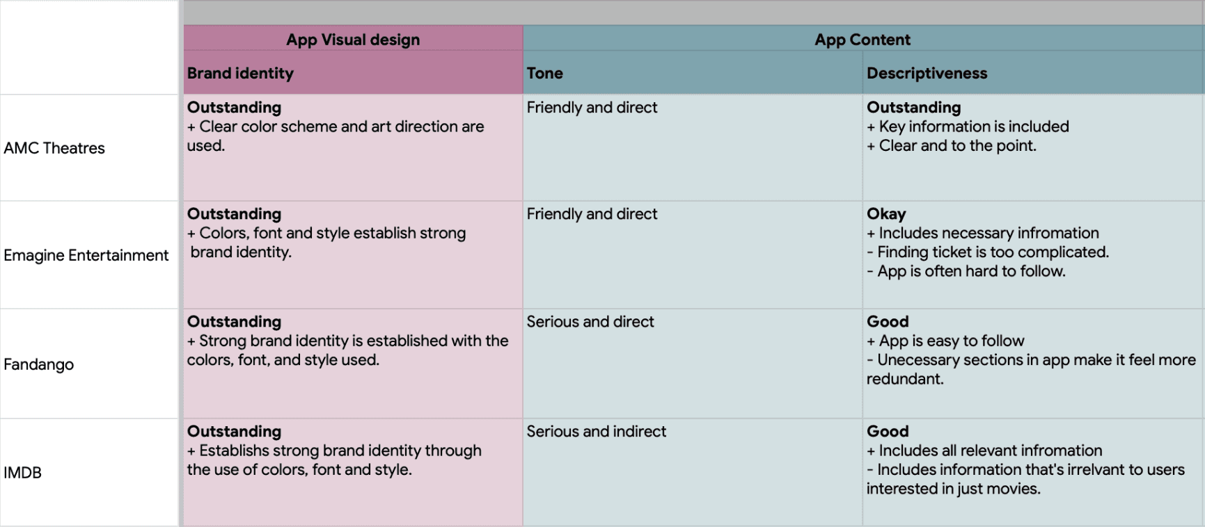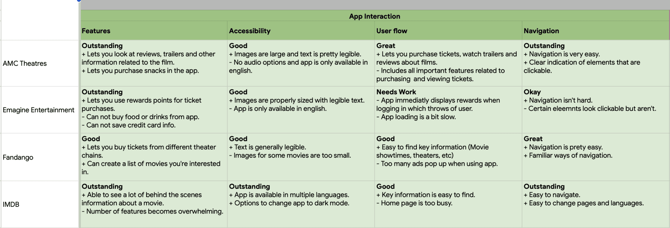 I conducted an analysis of 4 companies that were direct and indirect competitors. I took a look at how they provided users with movie tickets and what made each company stand out. I examined the different aspects of their apps, such as their features, accessibility, user flow, etc. Learning about the different strengths and weaknesses of each app helped me in designing a more refined app.