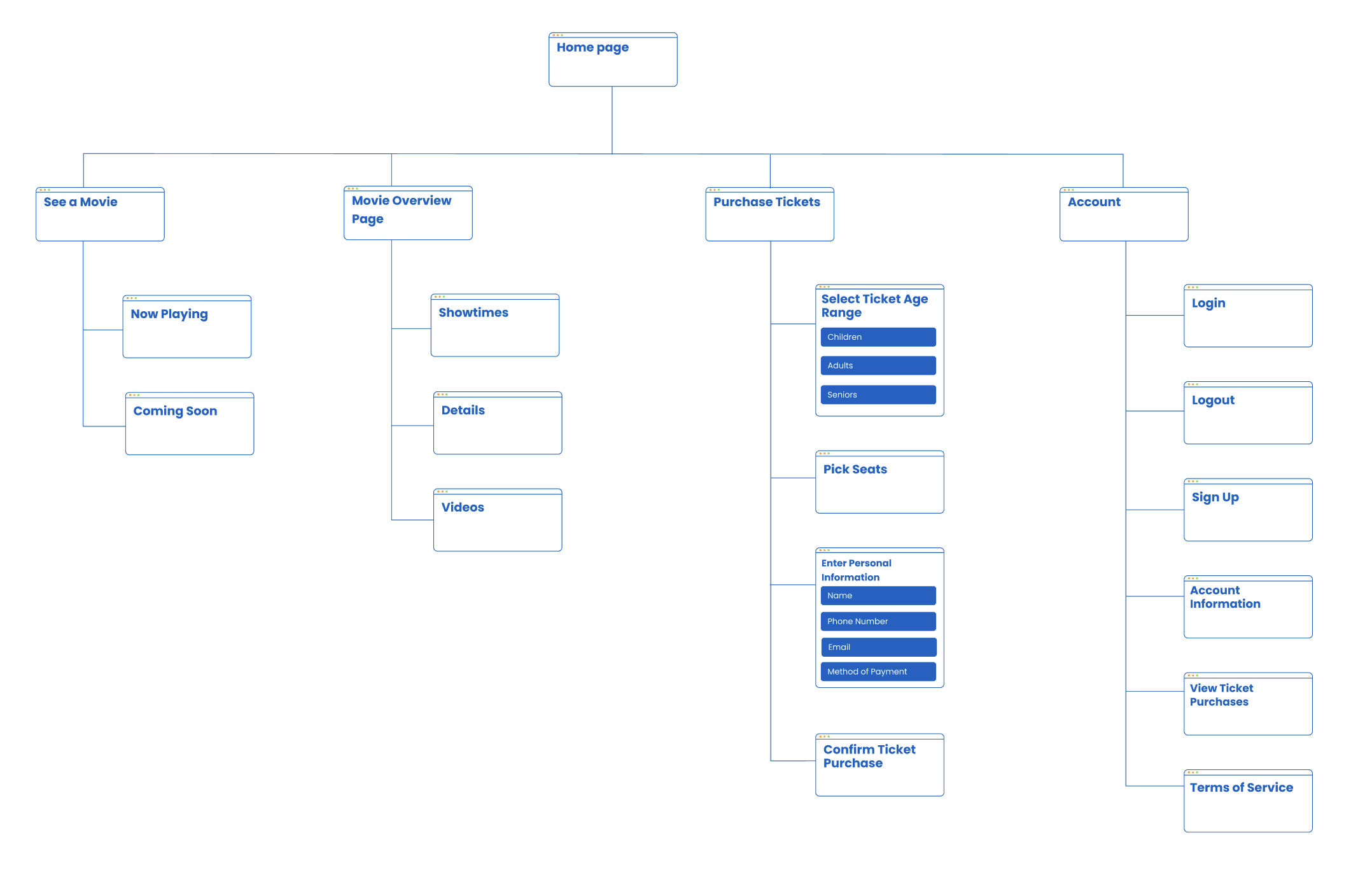 I made a sitemap so I could define the main pages and sub pages for the Pixel Theater app. The site map depicts users being able to see movies that are currently playing and that are coming soon. There is also the movie overview page which will allow users to see film information and purchase tickets. There's also the account page where users can complete different tasks like viewing their account information and seeing their ticket purchases.