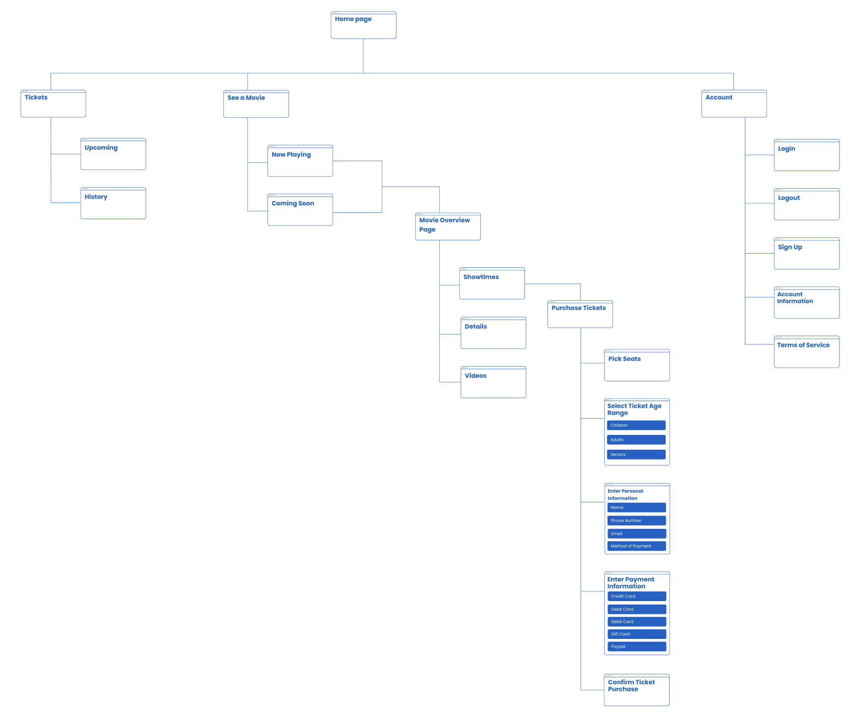 After the usability testing, I made some revisions to the structure of the site and noticed some issues with the site map so I made decided to make large revisions to the site map. For the Pixel Theater, the main pages now will be for seeing movies, looking at tickets, and there will be an account page. When user's click on a movie in the new playing or coming soon tabs, they are taken to a movie overview page where there are different tabs for showtimes, details and videos. The user after picking a showtime, then is taken to a series of pages for purchasing their tickets. The tickets page allows users to look at their tickets for upcoming movies they're going to see and their history of movies they've seen in the past. The account page allows them to look at different tabs for tasks like logging in, seeing account information or seeing terms of service.