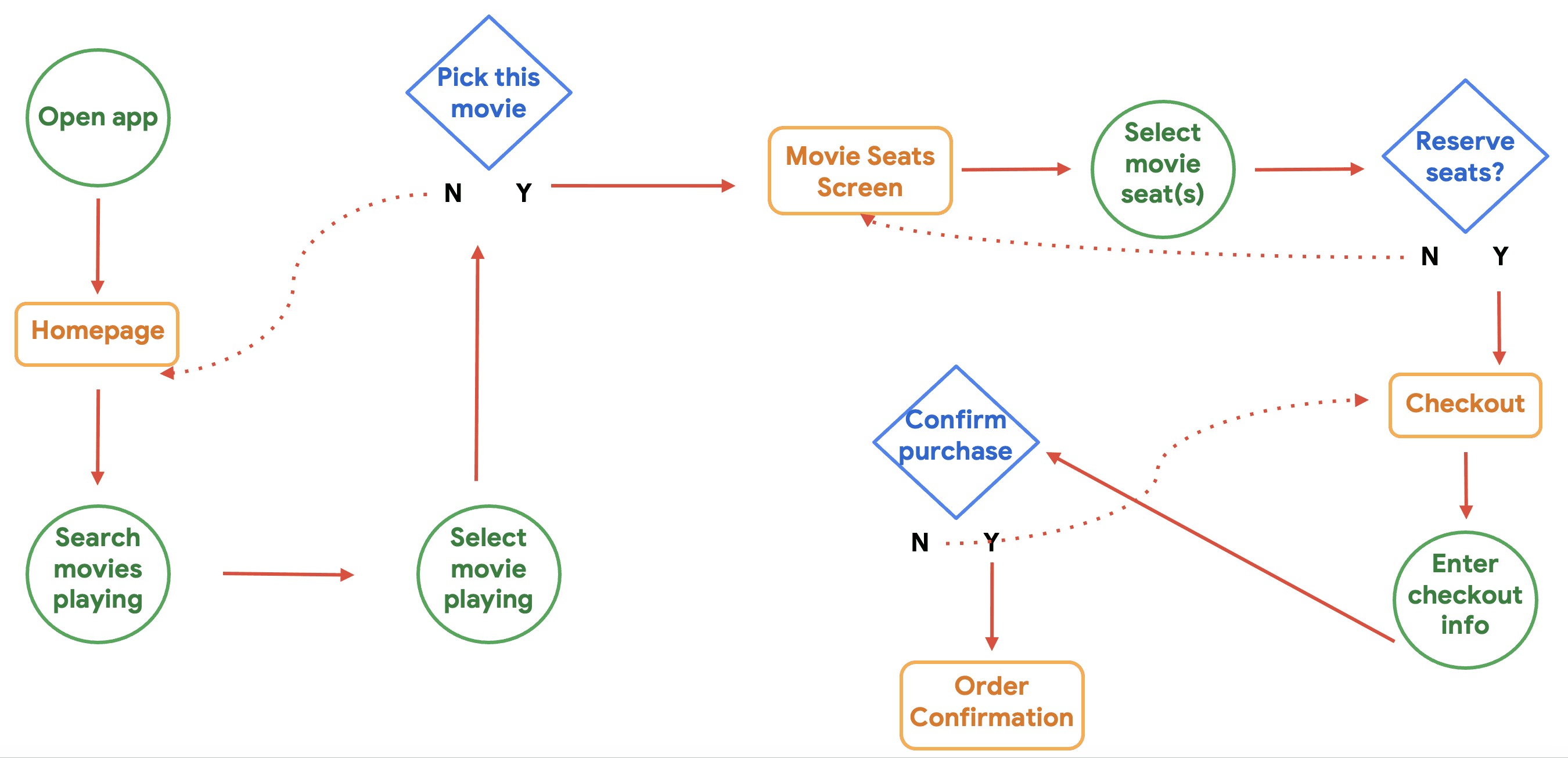 Below is the user flow that I made for the app. Items shown in green circles are actions that the user is making, items shown in yellow rectangles are screens the user is on and items in blue polygons are meant to depict decisions the user has to make. When the user first opens the app, they arrive at the home page, then they search movies that are playing and select a movie that interests them. After they have to make a decision to pick the movie that they selected.