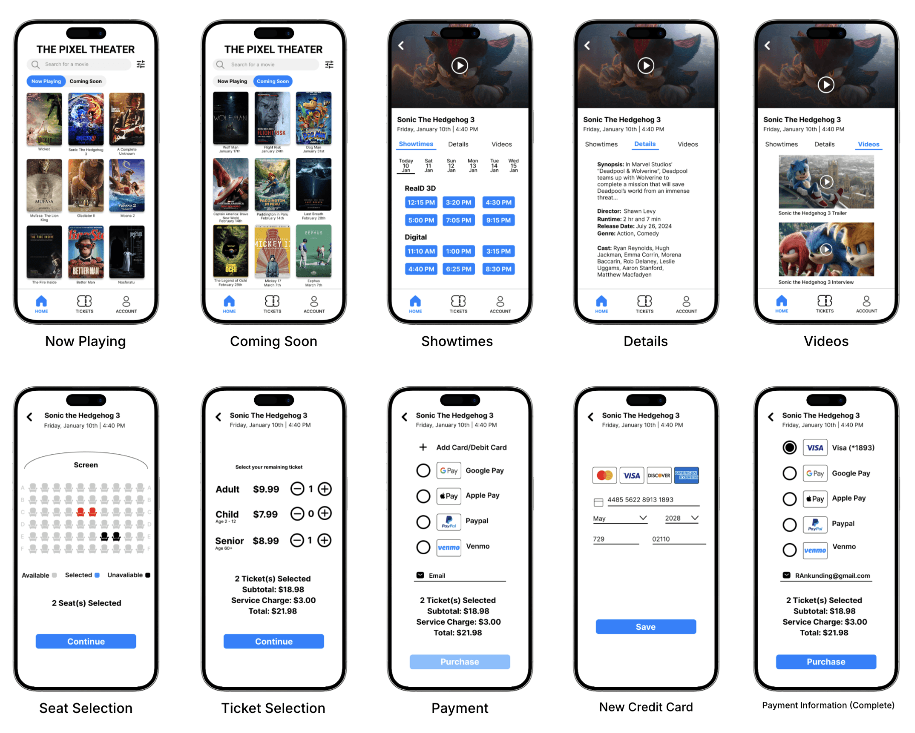 Following the usability studies, I ended up creating a high fidelity version of the application. This version included 3 main pages, a home page, a tickets page, and an account page. The home page lets you see movies that are now playing, and if you switch tabs you can see movies that are coming soon. Click on a movie will let you go to a showtimes page and you can switch to a movies details and videos. If you select a movies showtime, you can pick a movies seats and afterwards you can enter the payment information related to a movie. After the payment process is complete, you'll be able to see your ticket order confirmation. If the user wants to see their tickets for upcoming movies or if they want to see their ticket history, they can click on the tickets tab. User's may need to sign in to their account or create an account if they don't already have one yet.